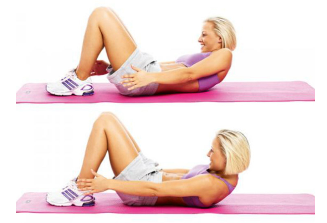 This exercise you target your lower and middle abs. Lie on your back with your legs stretched towards the ceiling and arms on your sides. Lift your upper back off the floor and extend your hands towards your feet. Try for your hand to reach your toes, breathe out contract your abs and crunch up your waist. Make sure your shoulders are off the mat and your lower back is flat on the floor. Follow 2 sets of this exercise with 15 reps.
